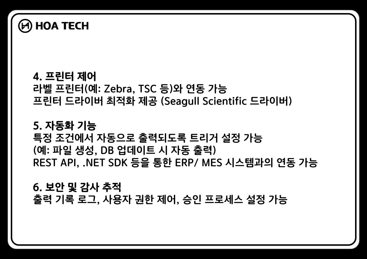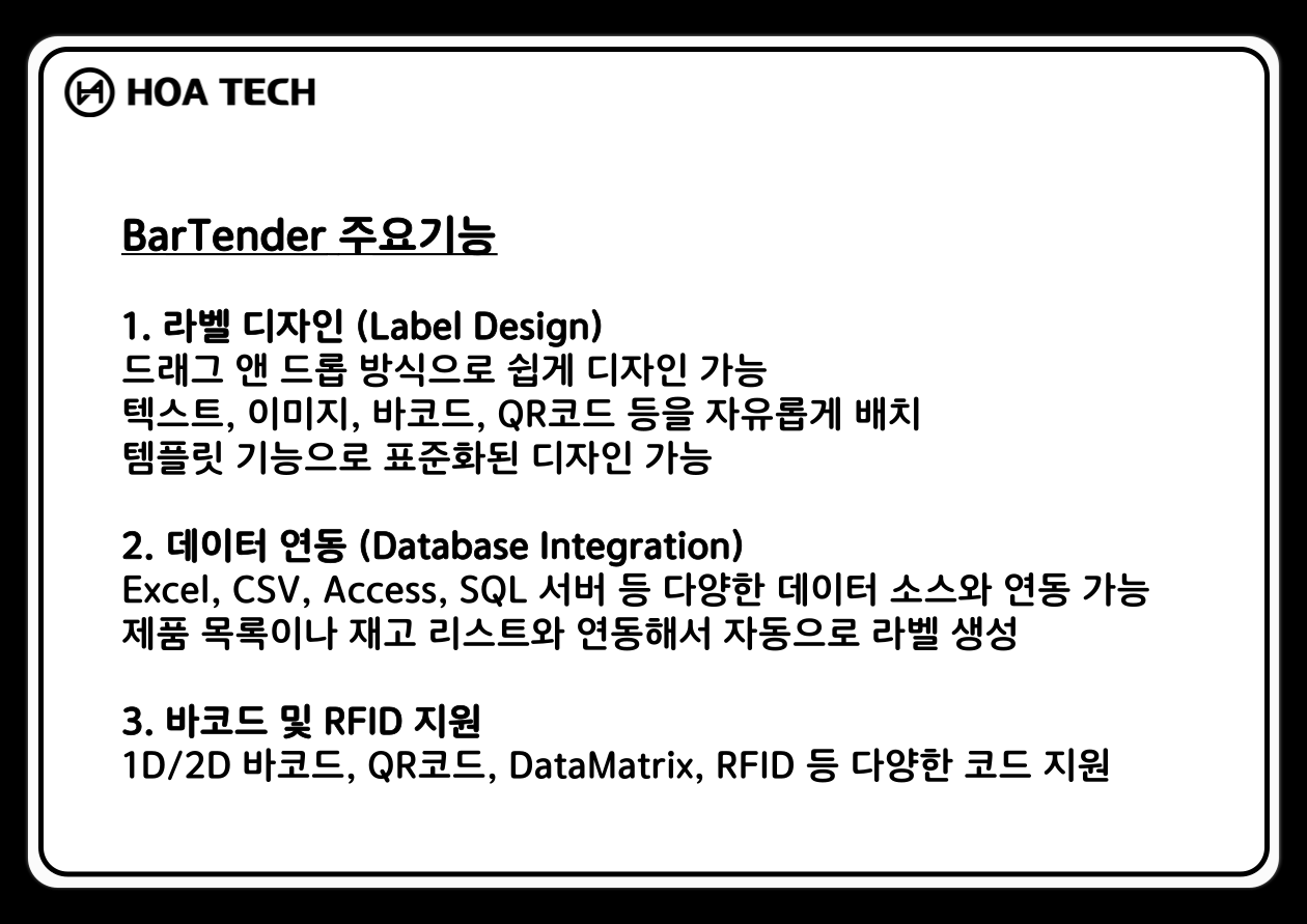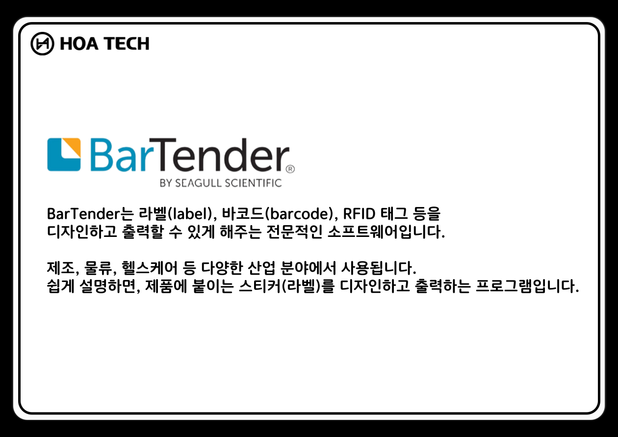 (주) 호아텍은 자체 맞춤형 라벨출력 솔루션 HOA TAG 및 정품 기성 프로그램을 공급합니다.